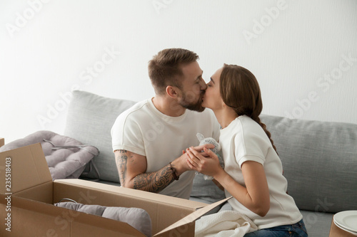 Young man and woman kissing sitting on sofa in living room with cardboard boxes with belongings, holding hands, preparing to moving, relocation, unboxing, unpacking, beginning living together