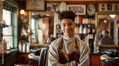 young man barber working in barber shop smiles lightly, looking at camera.