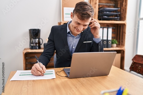 Young man call center agent smiling confident working at office
