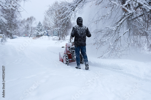 young man clearing snow in his backyard with wheeled snow blower