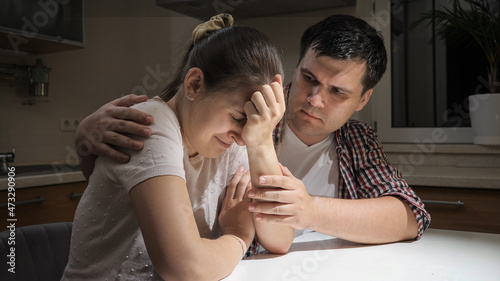 Young man consoling and hugging his crying wife on kitchen at night. Concept of despair, stress, depression, anxiety, family problems, divorce and frustration.