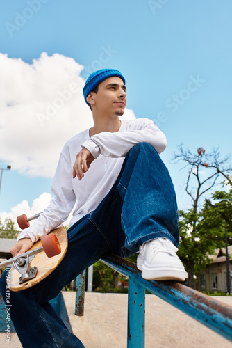 Young man enjoying a sunny day at the park while sitting on a railing with his skateboard