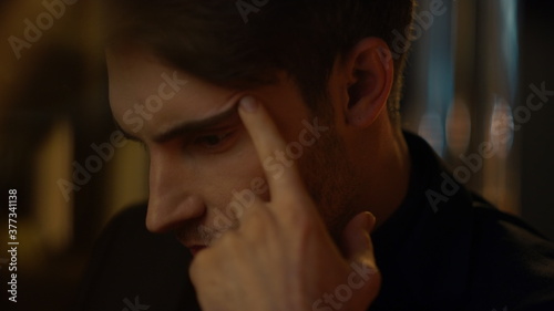 Young man face looking camera indoors. Handsome guy thinking inside.