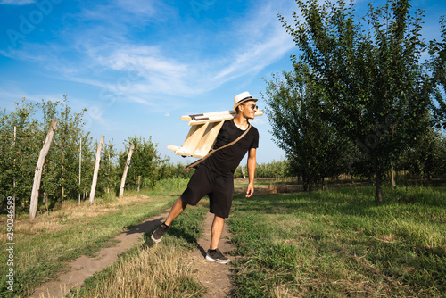 Young man gardener in white hat black t-shirt and sunglasses with stepladder on his shoulder standing on one leg among his gardens and looking into the distance