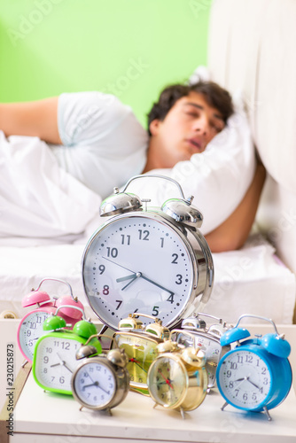 Young man having trouble waking up in early morning