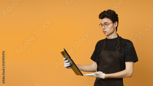 young man in a black t-shirt and apron in work gloves with a tablet for papers in his hands is perplexed and looks away at copy space