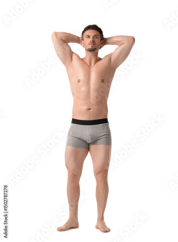 Young man in stylish light grey underwear on white background
