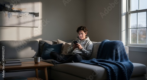 Young man relaxing on a couch while using his smartphone in a sunlit living room