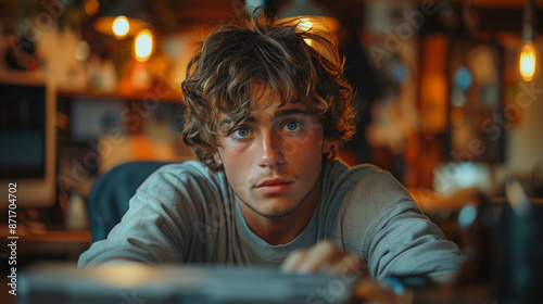 Young man sitting at a table in a restaurant. Generative AI