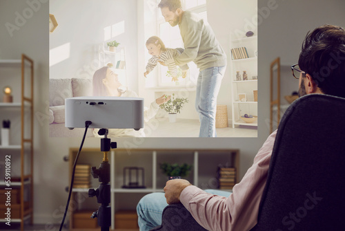 Young man sitting in an armchair at home, watching a good family movie, looking at family photos and videos on a modern projector, relaxing, and enjoying leisure time