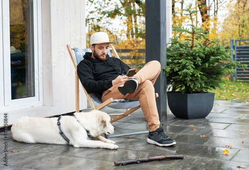 Young man sitting with dog on terrace.