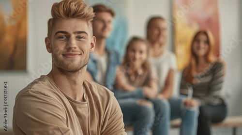 Young man smiling confidently with a blurred group of friends in the background, illustrating themes of friendship and happiness. Concept of youth, togetherness, and positive social interactions.