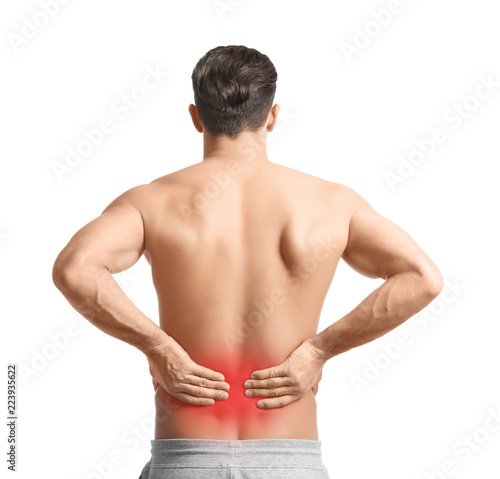 Young man suffering from back pain on white background