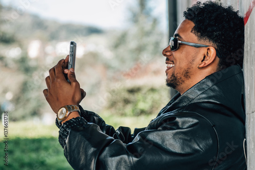 young man urban style on the street with mobile phone or smartphone