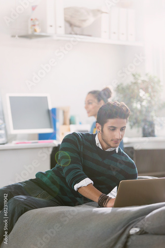 Young man using laptop on bed