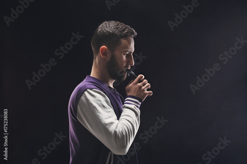 Young man vaping e-cigarette on black