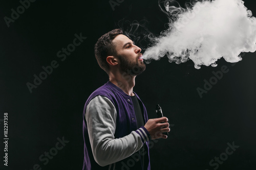 Young man vaping e-cigarette with smoke on black