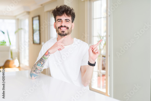 Young man wearing casual t-shirt sitting on white table smiling and looking at the camera pointing with two hands and fingers to the side.