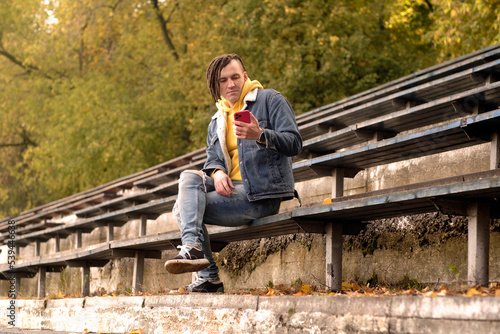Young man with dreadlocks browsing mobile phone, sitting on old shabby bench of street bleacher.