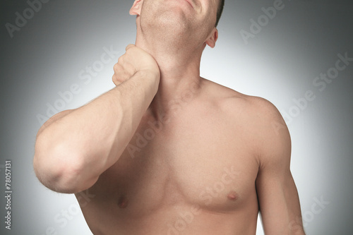 Young man with neck pain, isolated on white