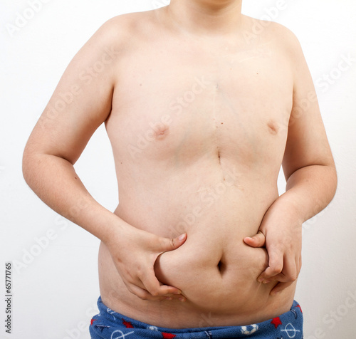 young man with obesity shows fat on his belly