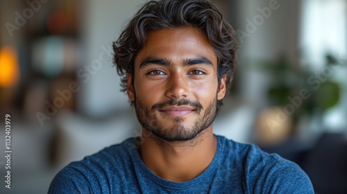 Young man with tousled hair and beard wearing a casual shirt in a softly lit indoor setting Generative AI