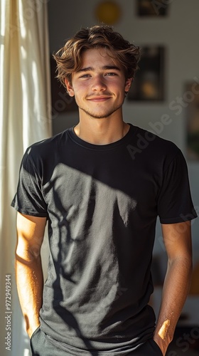 Young man with wavy hair and a light beard smiles while standing indoors, wearing a black t-shirt, hands in pockets