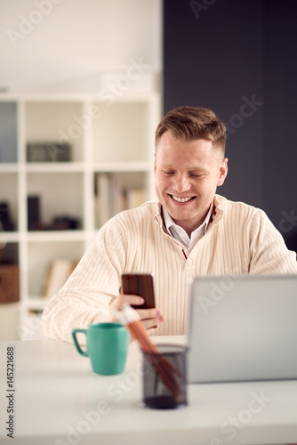 Young man working in modern office, sitting at the table with laptop, texting over mobile phone