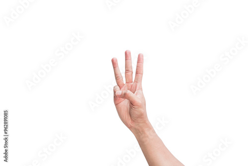 Young man's hand showing fingers on isolated white background. Counting number 3 with three fingers showing. Clipping Path