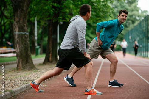 Young men exercising on a race track. Two young friends training outdoors..