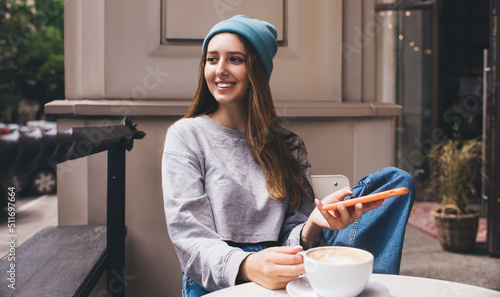 Young millennial female using application on mobile phone while drink coffee. Caucasian hipster girl holding smartphone in stylish silicone case. Teenager with cellphone enjoying free time in city