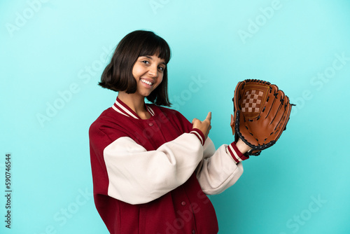 Young mixed race player woman with baseball glove isolated on blue background pointing back