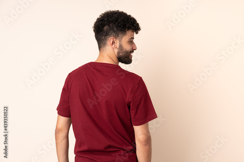 Young Moroccan man isolated on beige background in back position and looking side