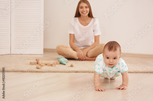 Young mother and cute baby playing on floor at home