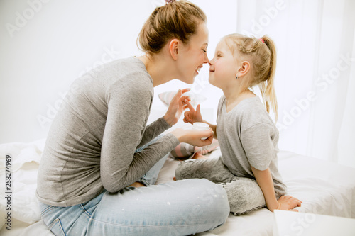 Young mother and her little daughter at home at sunny morning. Soft pastel colors. Happy family time on weekend. Mother's Day concept. Family, love, lifestyle, motherhood and tender moments concepts.