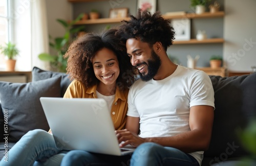 Young multiracial couple sits on sofa using laptop at home. Happy diverse husband, wife enjoy technology lifestyle together, browsing internet, online services entertainment. Relaxed bonding in cozy