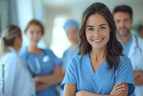 Young nurse with medical team in soft focus