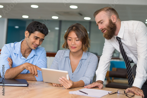 Young office employees testing and discussing new business app. Multiethnic group of three discussing content on tablet screen. Communication concept