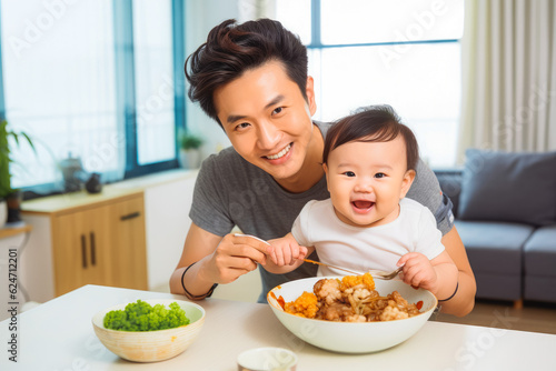 Young parent eating chinese food at home with child. Generative AI