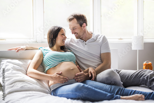 Young parents in bed expecting a little baby, Romantic moments for pregnant couple