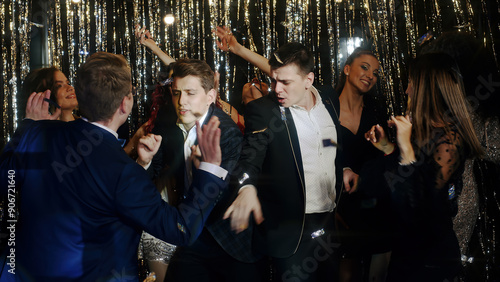 Young people dancing to electronic music, jumping and having fun on the dance floor under vibrant disco lights. A dynamic scene ideal for showcasing lively nightlife and energetic party vibes.