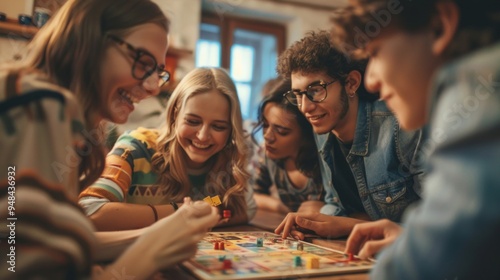 Young people play a lively board game at a wooden table, rolling dice and moving pieces. The setting is casual and fun, with a focus on enjoyment and friendship.