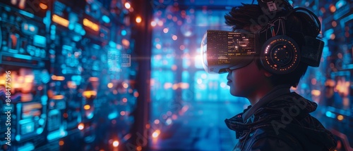 Young person immersed in virtual reality simulation with futuristic background, showcasing advanced technology and immersive digital experience.