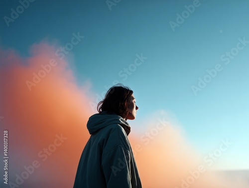 Young person standing in front of colorful smoke cloud under clear blue sky at sunrise
