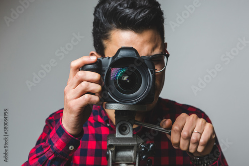 Young Photographer with a Digital Reflex Camera on a Tripod