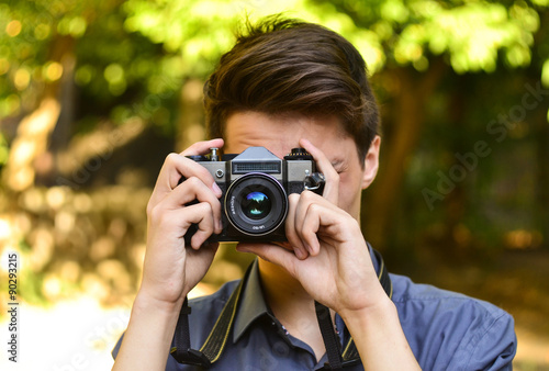 Young photographer with retro film camera