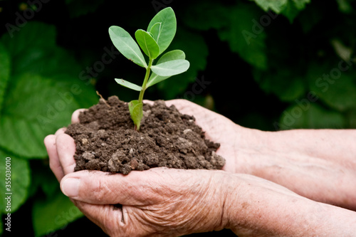 Young plant in the soil close-up. A handful of land with a sprouted green plant in the wrinkled palms of an old grandmother close-up. Human interaction with nature. Influence people on the ecology