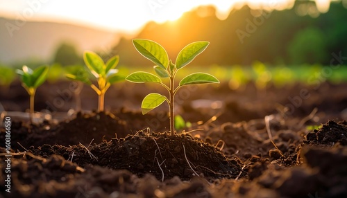 Young plants sprouting in fertile soil at sunset