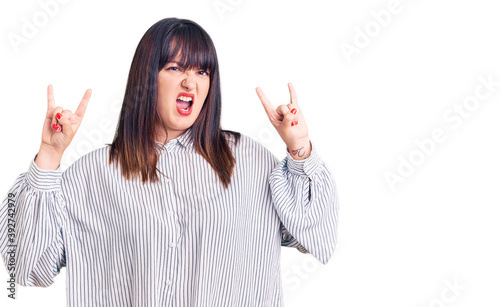 Young plus size woman wearing casual clothes shouting with crazy expression doing rock symbol with hands up. music star. heavy concept.