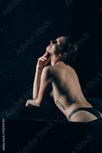 Young pretty brunette woman in bath with water and flowers. Naked model during an unusual photo shoot in a black bath